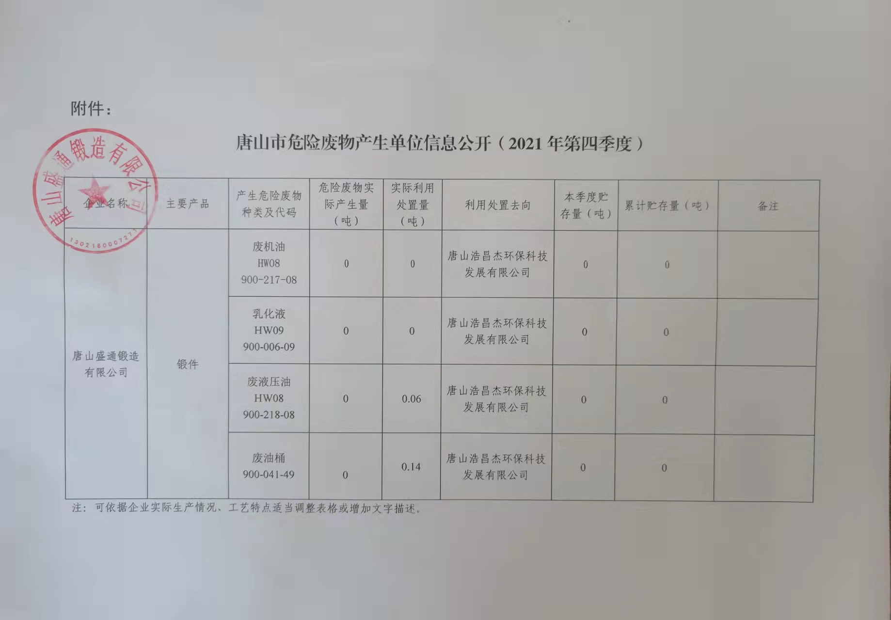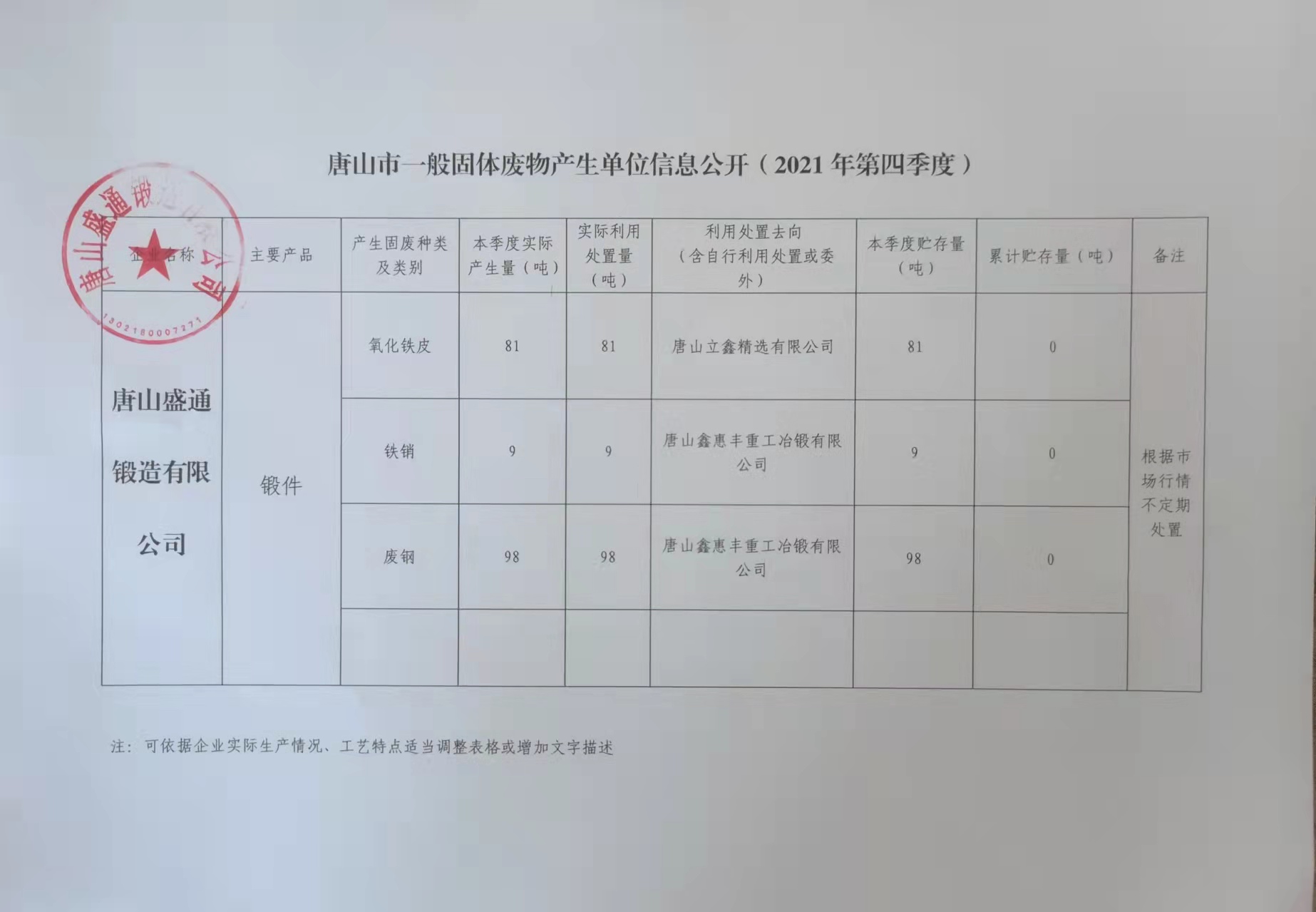 唐山盛通锻造有限公司2021年第四季度信息公开